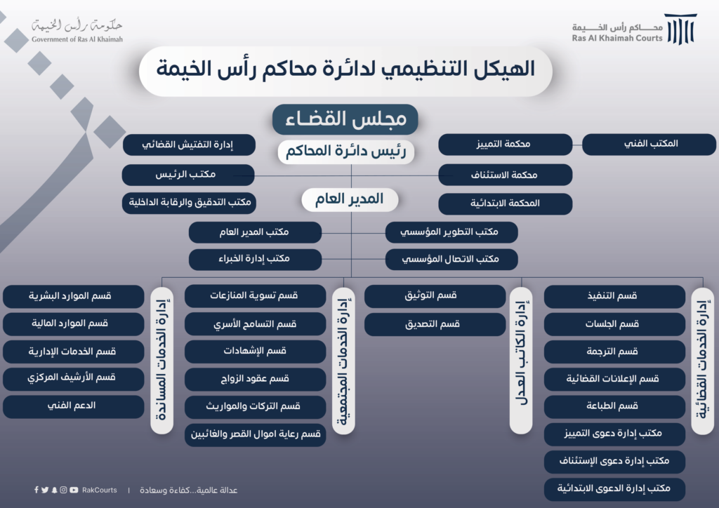 على الصعيد الإداريّ والتنظيمي، لقد أصدر المغفور له الشيخ صقر بن محمد القاسمي قانون تنظيم القضاء بإمارة رأس الخيمة للعام 2002، وأتبعه بالمرسوم الأميري رقم 7 للعام 2002 بشأن الهيكل التنظيمي لدائرة المحاكم، والذي تم تطويره بعد 4 سنوات من خلال استصدار المرسوم الأميري رقم 11 للعام 2006 في شأن الهيكل التنظيمي لدائرة محاكم رأس الخيمة، والذي فعّل منظومة من الانسجام والتناسق الإداري والتنظيمي بين الإدارات والأقسام لتلبية كافة احتياجات الدائرة للقيام بالمهام الموكلة إليها – القضائية والإدارية والتوثيقية والمجتمعية. كما باتت واجبات القضاة وأعضاء النيابة العامة وكيفية مساءلتهم واضحة وجلية، وتم إنشاء إدارة للتفتيش القضائيِ تقوم بالتفتيش على أعمالهم وتقدير كفاءتِهم، ولم يغفل هذا النسق القضائي المتجانس أعوان القضاة من الكتبة والمعلنين والمترجمين، فتم تحديد مهامهم لتلبية متطلبات التقاضي والمحاكمات.